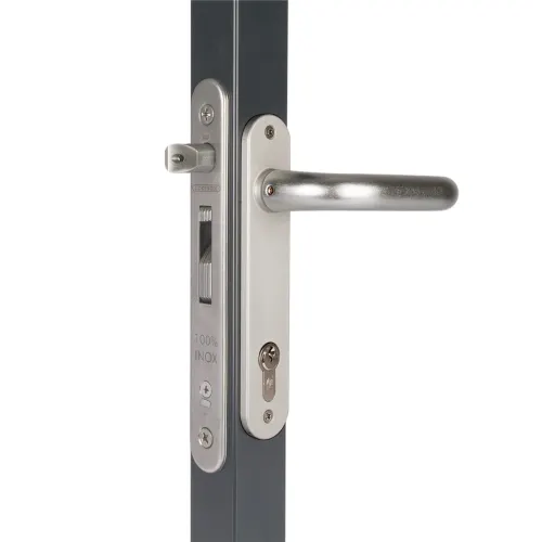 Serrure à encastrer avec mécanisme 100% en acier inoxydable. Le réglage du pène demi-tour et la combinaison du crochet inoxydable avec la gâche anti-écartement permet une fermeture sûre et sécuritaire de votre portail. Cette serrure peut être utilisée dans l’acier, l’aluminium et le PVC. Avec son système bréveté « Click-It » la serrure est montée en quelques secondes.